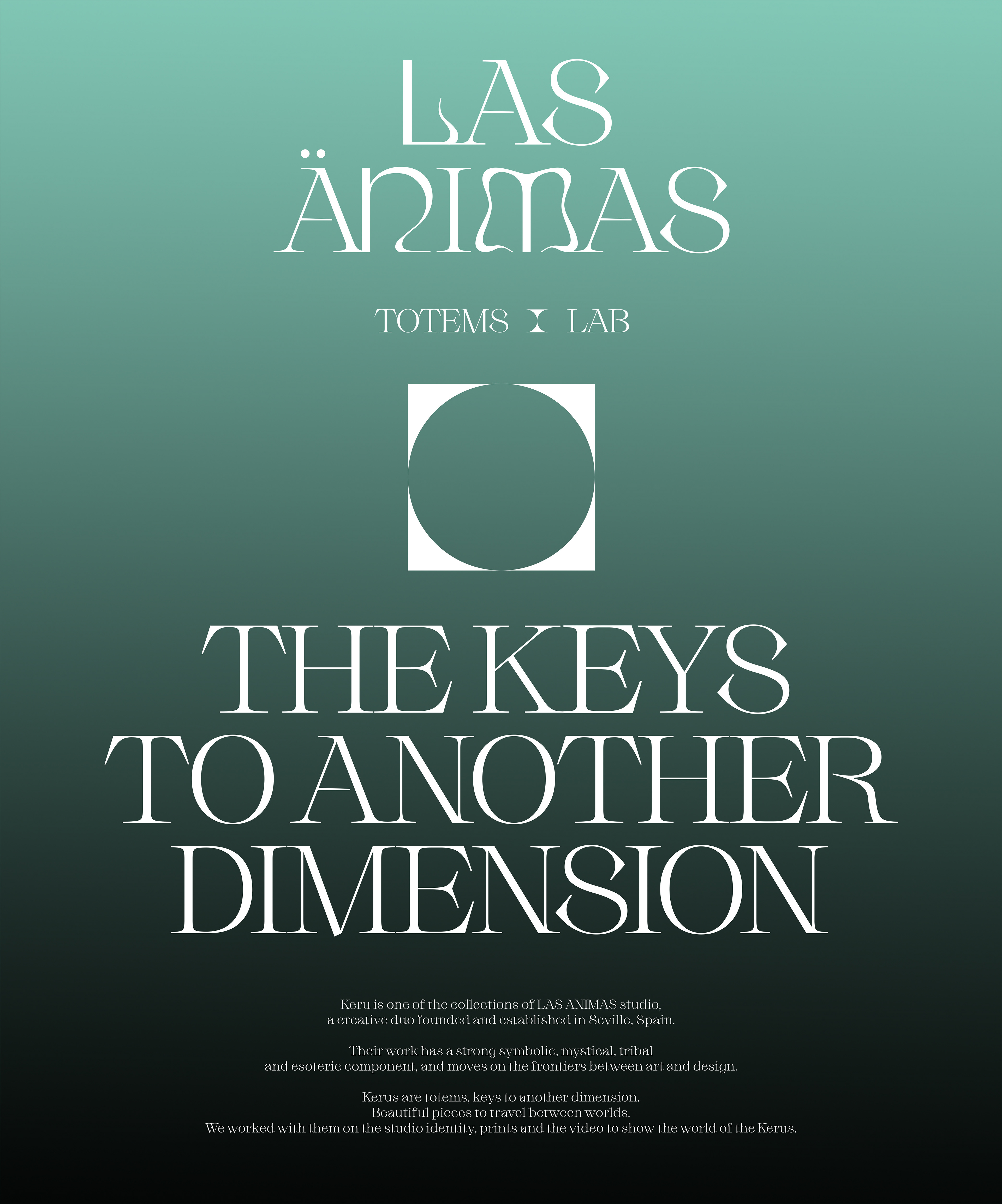 Keru is one of the collections of LAS ÁNIMAS studio, a creative duo founded and established in Seville, Spain. Their work has a strong symbolic, mystical, tribal and esoteric component, and moves on the frontiers between art and design. Kerus are totems, keys to another dimension. Beautiful pieces to travel between worlds. We worked with them on the studio identity, prints and the video to show the world of the Kerus.